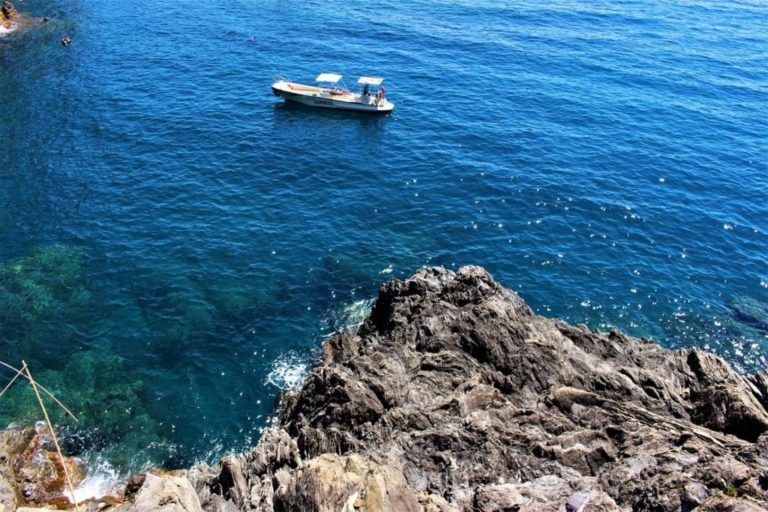 Limpido, blu, protagonista: ecco il mare delle Cinque Terre che lambisce la costa frastagliata e scoscesa della Liguria.