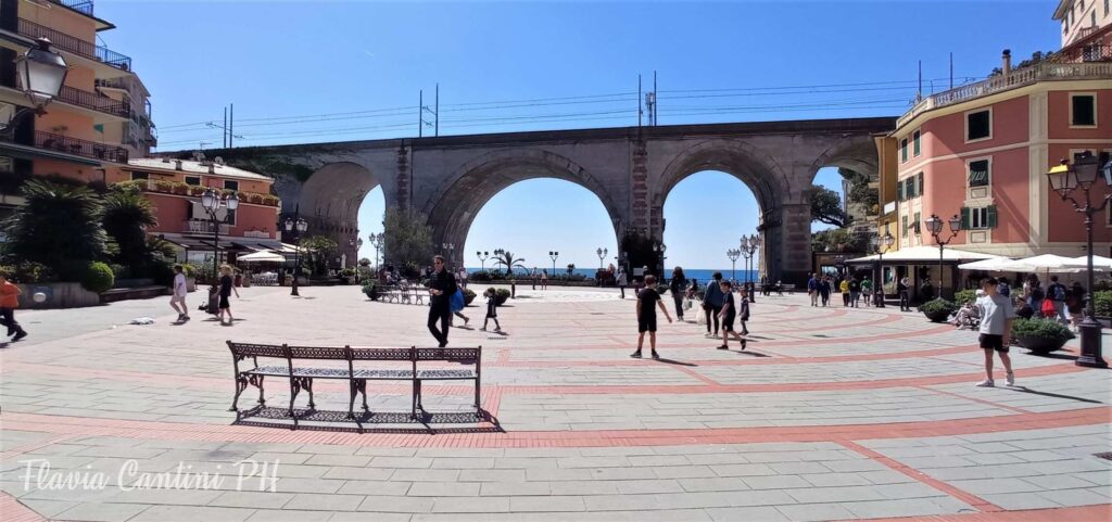 Sensazione più che confermata dall’arrivo nel cuore del borgo, in Piazza XXVII Dicembre, la piazzetta vivacizzata dalle tipiche case multicolore e sovrastata dall’imponente ponte della ferrovia che lascia intravedere il blu del mare poco lontano; come anche per la bellissima Sori, trovo che sia un valore aggiunto: sarà che amo spostarmi in treno, ma osservare i convogli passare lassù in alto mi regala un pensiero di libertà.